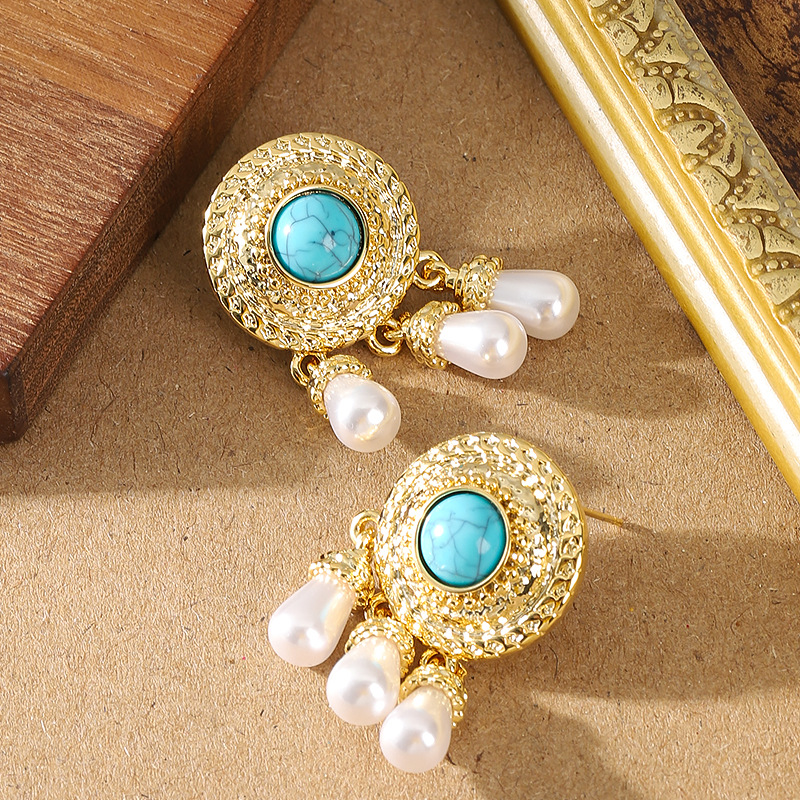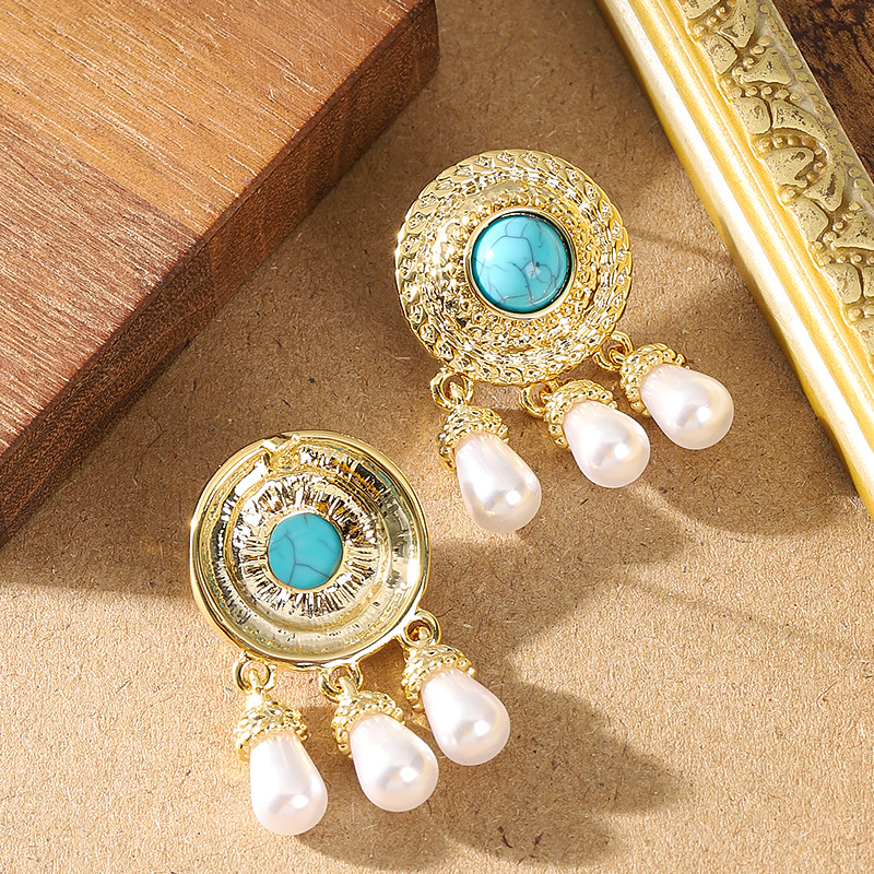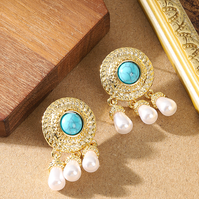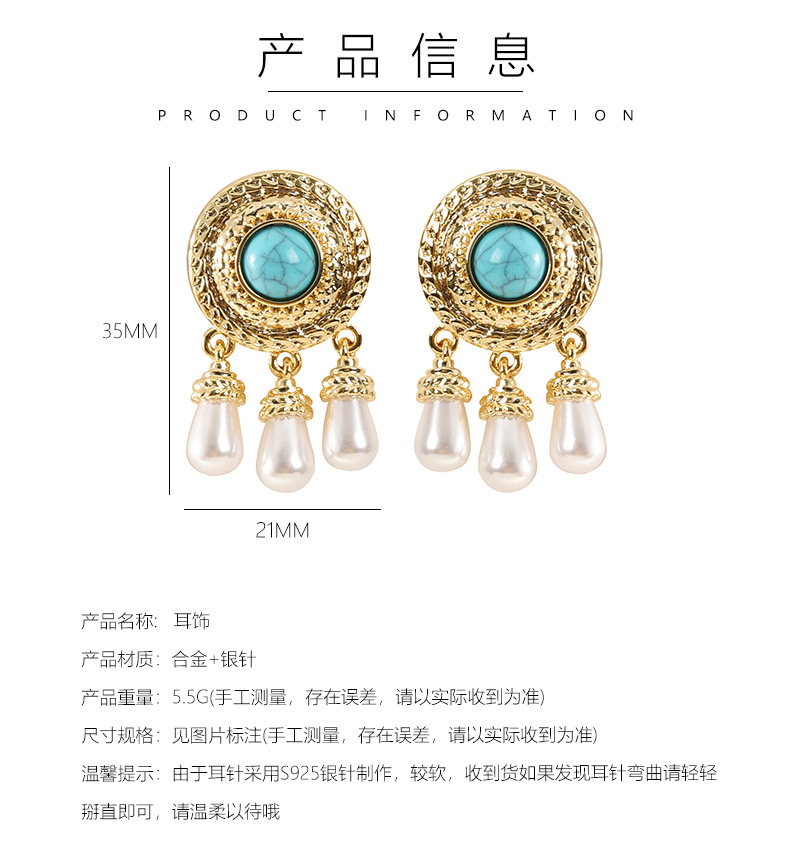 國潮復古民族風藍松石珍珠吊墜流蘇耳環女輕奢高級感個性銀針耳飾