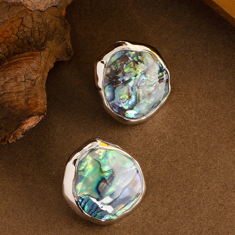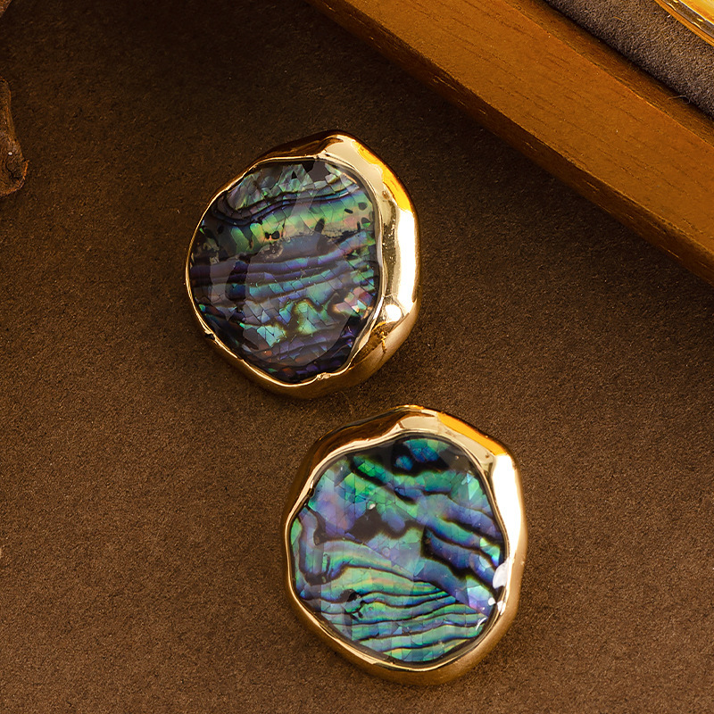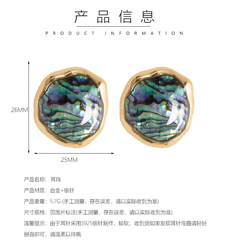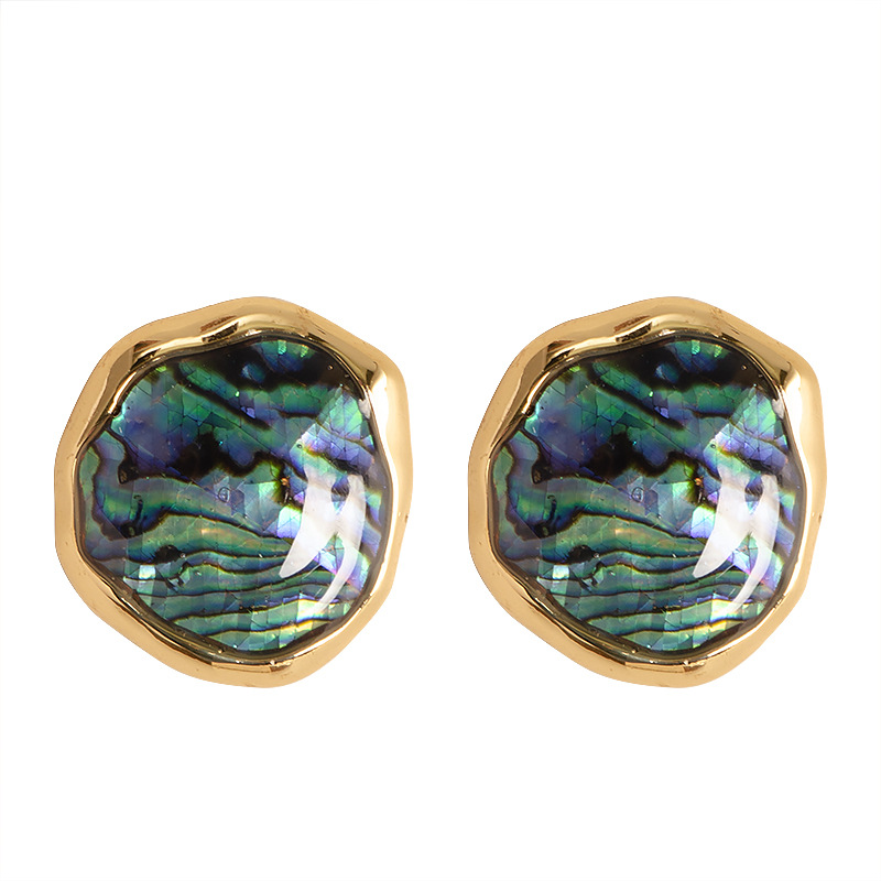 此款耳飾鑲嵌的是天然鮑魚貝殼,而非人工染色貝殼,由於其天然的特殊性,所以花紋色澤每個批次略有不同,請知悉哦