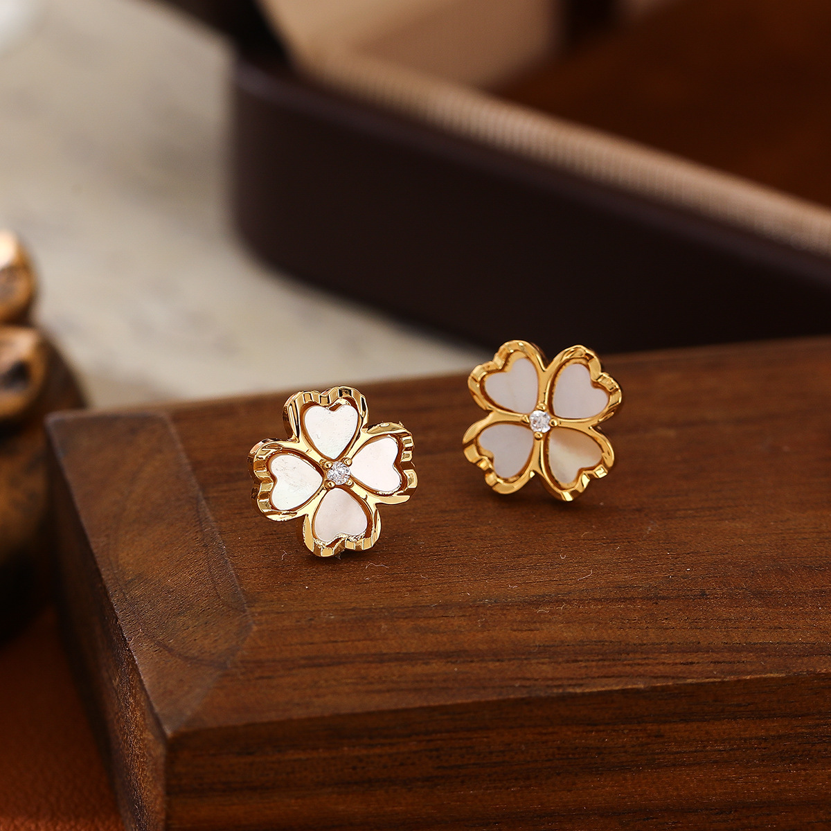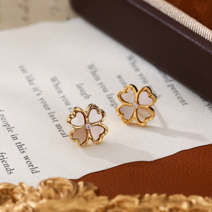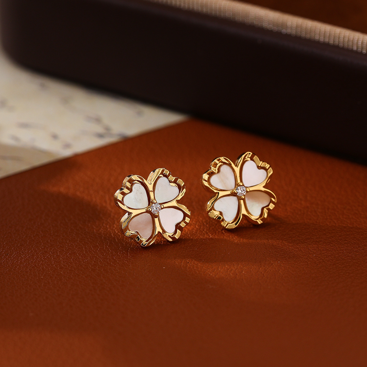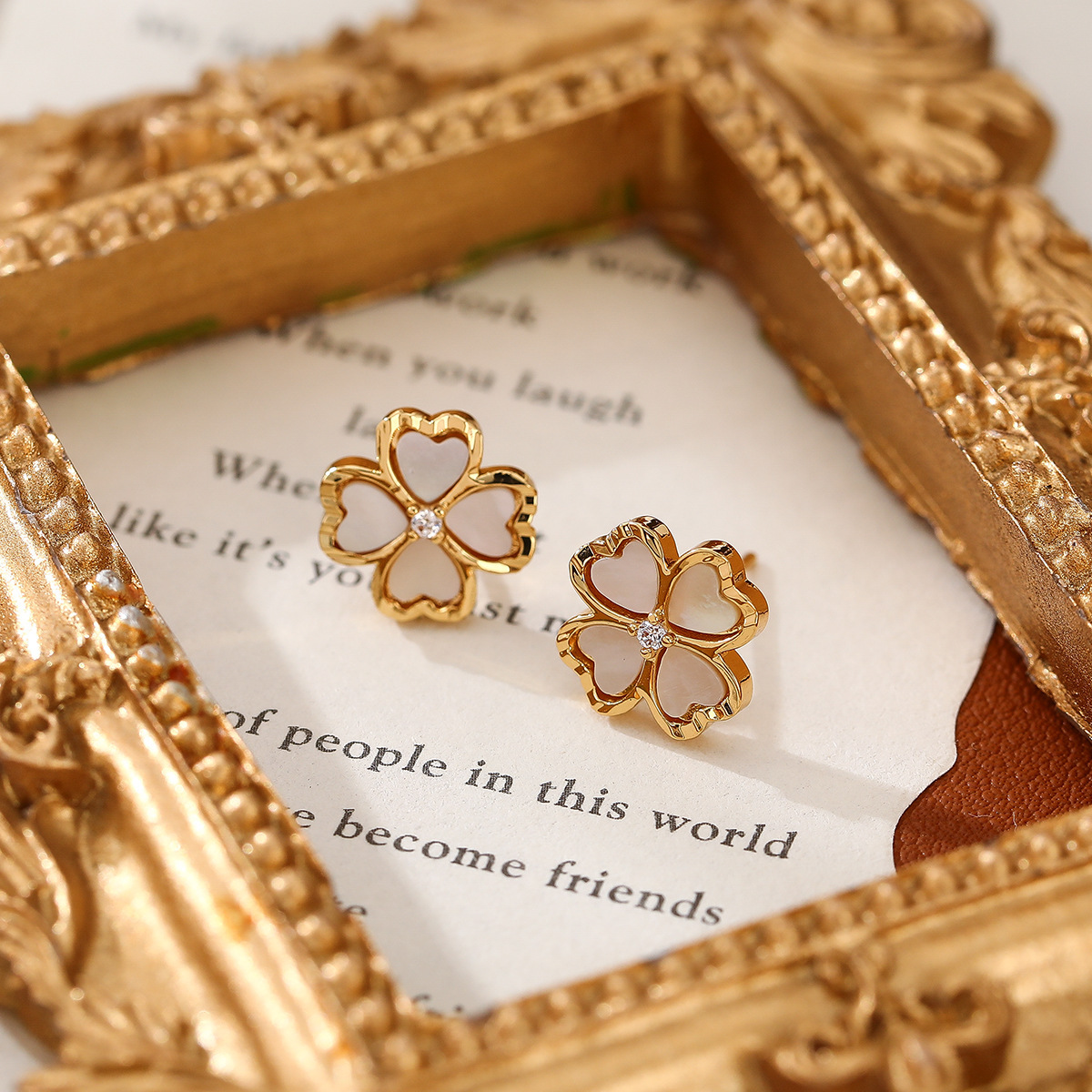 法式四叶草桃心耳钉|天然母贝工艺小巧精致耳饰