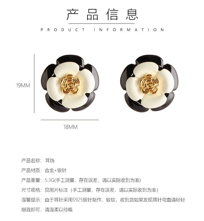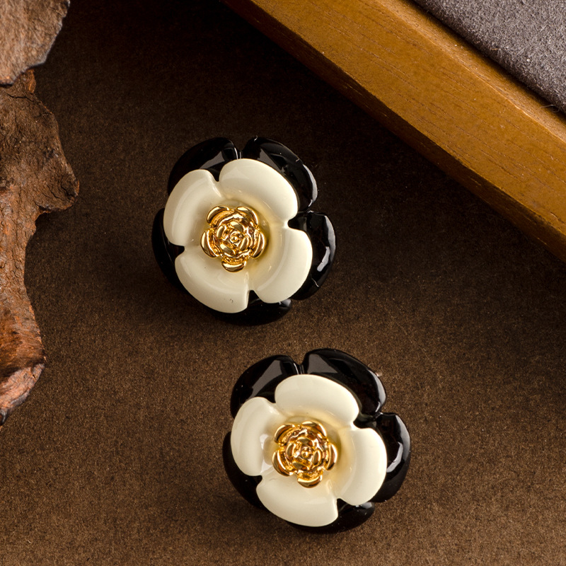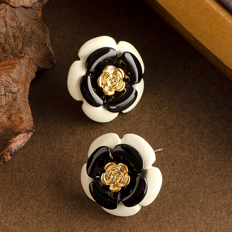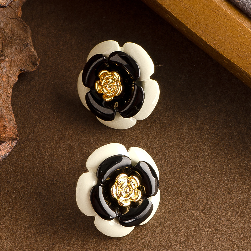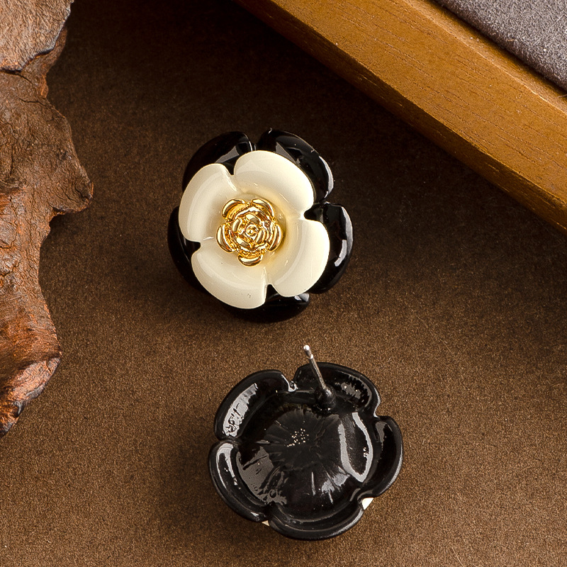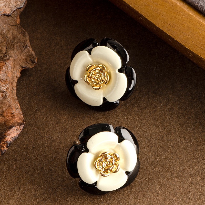 法式輕奢優雅小香風滴油琺琅釉黑白山茶花耳釘女高級百搭銀針耳飾