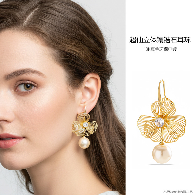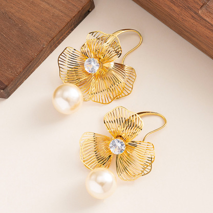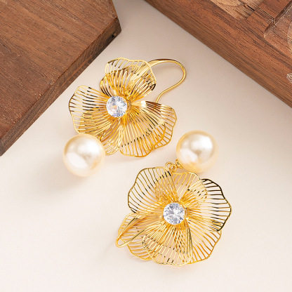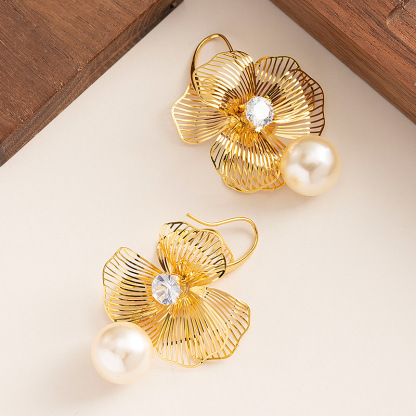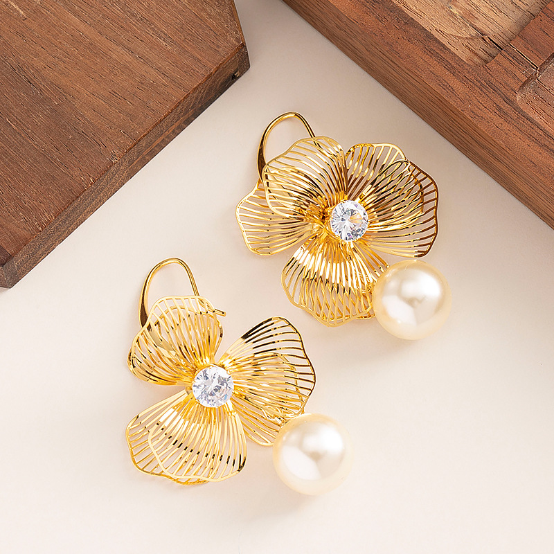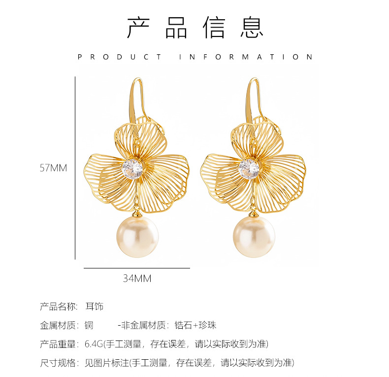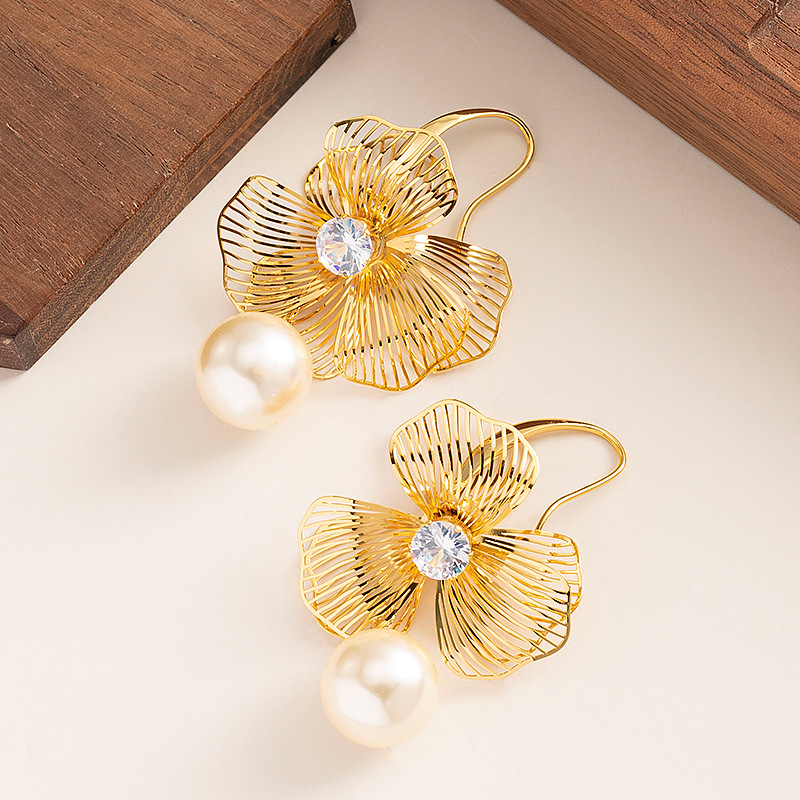 立體鏤空花朵珍珠耳環|冷淡風鑲鋯石氣質精緻耳飾