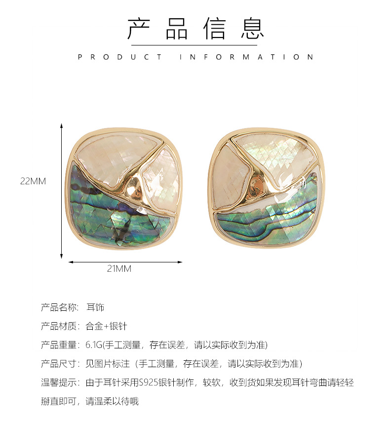 此款耳飾鑲嵌的是天然鮑魚貝殼,而非人工染色貝殼,由於其天然的特殊性,所以花紋色澤每個批次略有不同,請知悉哦
