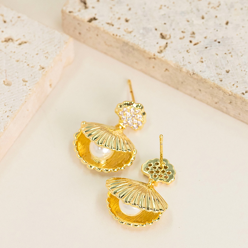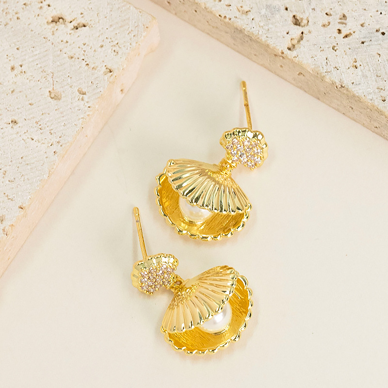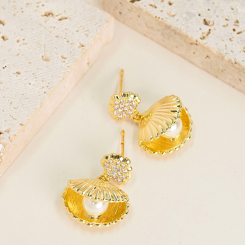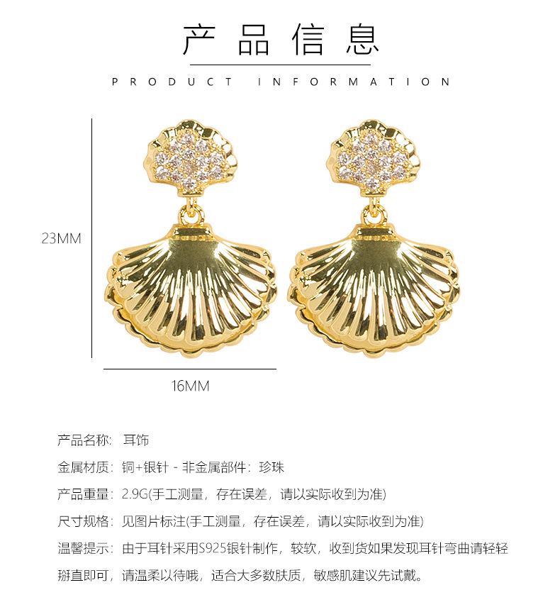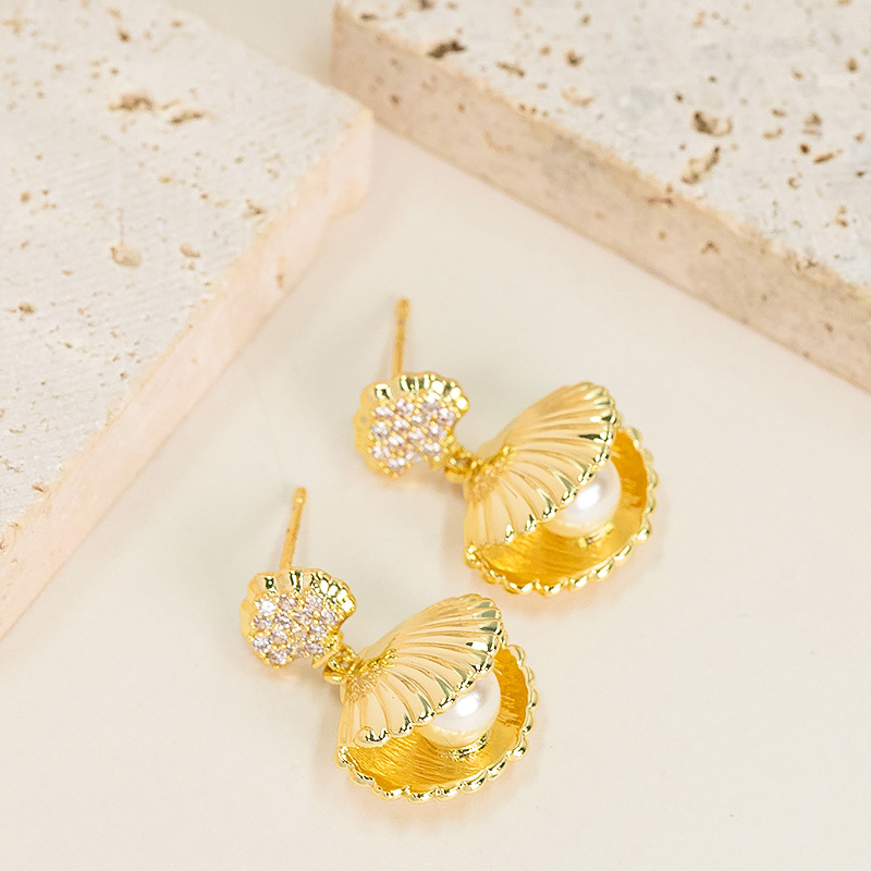 韓版超仙精緻滿鑽仿貝殼珍珠耳釘耳環女氣質甜美百搭時髦銀針耳飾
